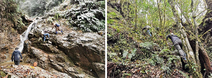 沿泥石流溝順溝而上現(xiàn)場勘察工作