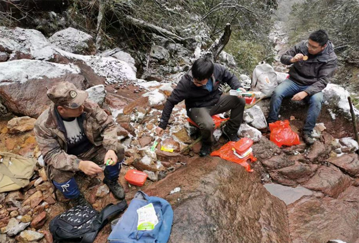 2021年12月的一天,勘察分院麥高飛同志與其他同志早上7點天未亮就起床去腳基坪電站廠房接向導(林場護林員),8點30分在溝口架設好RTK基站后,他們和兩名向導就沿著泥石流溝(黃沙溝)順溝而上,沿途雨雪交加,雪越下越大,到處都是陡坎跌水與溪流,在向導帶領下,他們四肢并用攀爬在亂石遍布的溝谷,經(jīng)過不懈的努力,終于在中午兩點左右測放完粽隧ZK2號深孔。饑寒交迫的他們在附近的小溪邊冒雪草草吃了幾口自熱方便飯后,就立即返程。于晚上6點30分左右安全到達腳基坪電站附近的318國道邊,共用時10個小時。在上山的路上,汗水濕透了內(nèi)衣,雨雪打濕了外套,放孔后的他們被寒風吹得瑟瑟發(fā)抖,艱難到達318國道邊后,累得癱坐在公路邊的值班車上,只想坐下來好好休息。這僅僅是麥高飛同志進行地質勘察工作的一個縮影!這也是麥高飛同志的工作日常!