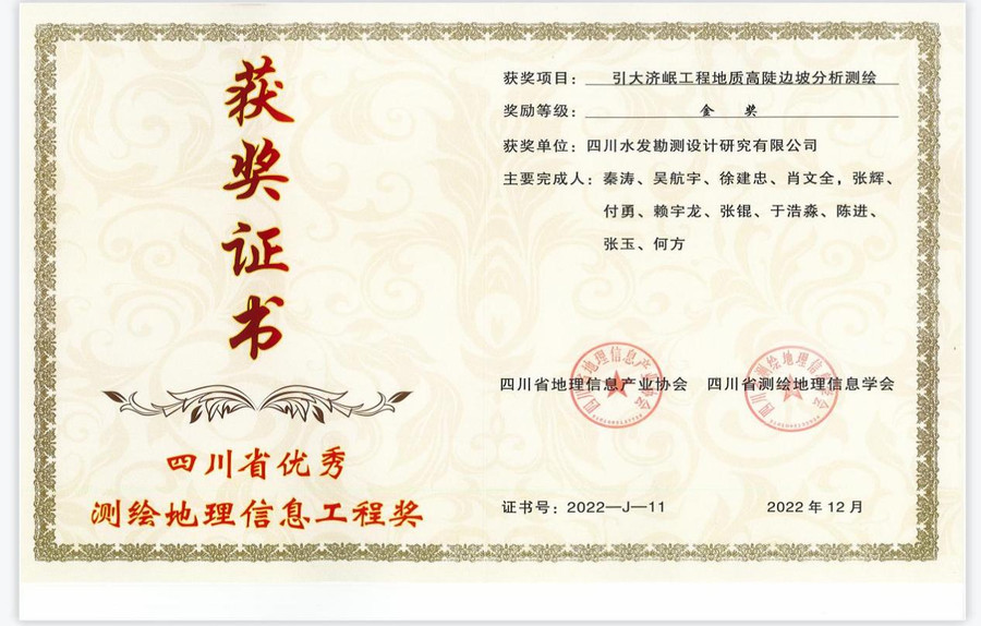 經(jīng)四川省測(cè)繪地理信息學(xué)會(huì)和四川省地理信息產(chǎn)業(yè)協(xié)會(huì)聯(lián)合評(píng)選認(rèn)定,水發(fā)集團(tuán)設(shè)計(jì)公司測(cè)繪分院完成的“引大濟(jì)岷工程地質(zhì)高陡邊坡分析測(cè)繪”和“亭子口灌區(qū)工程新市支渠測(cè)量工程”兩個(gè)項(xiàng)目分別榮獲“2022年四川省優(yōu)秀測(cè)繪地理信息工程獎(jiǎng)”金獎(jiǎng)和銅獎(jiǎng)。