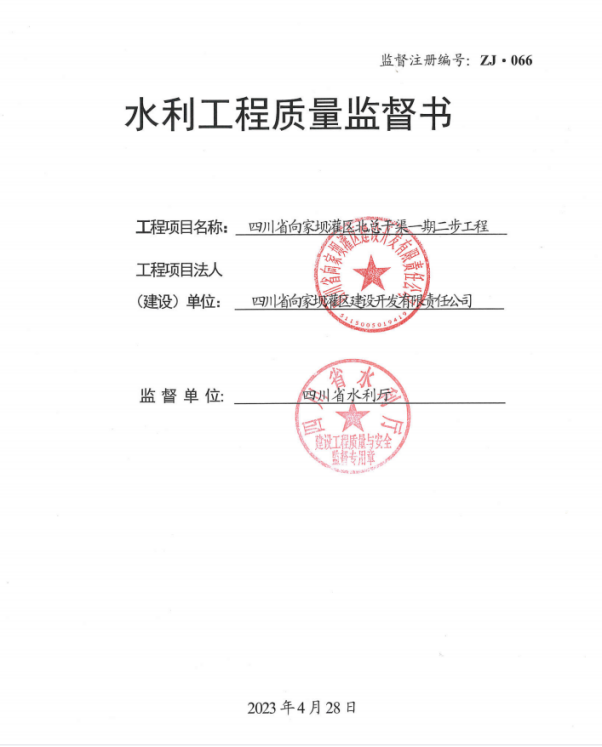 4月28日,《四川省向家壩灌區(qū)一期二步工程質(zhì)量監(jiān)督書》(監(jiān)督注冊編號:ZJ-066)正式下發(fā)至公司,標志著向家壩灌區(qū)北總干渠一期二步工程質(zhì)量監(jiān)督手續(xù)順利取得。