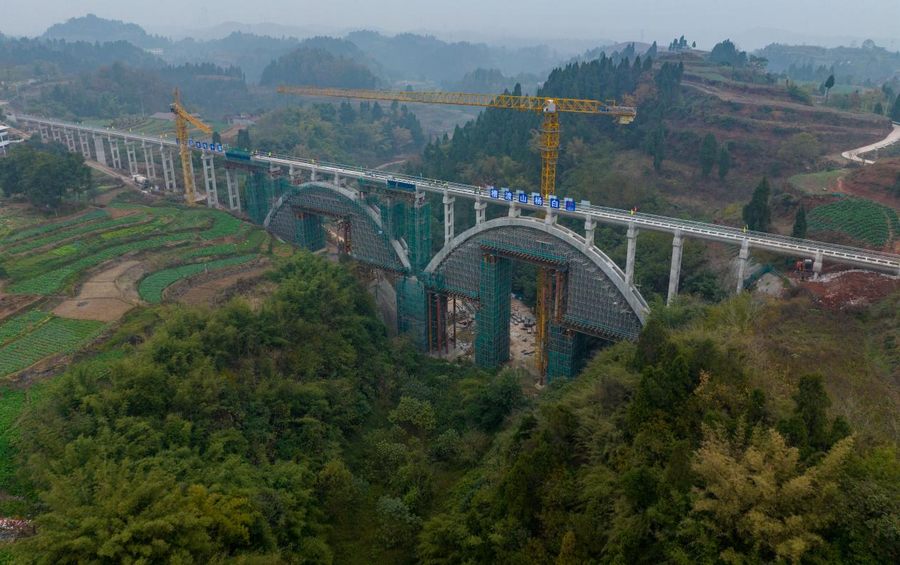 白楊山渡槽位于向家壩灌區(qū)北總干渠一期一步工程真溪支渠第二流量段,全長330米,槽身共31跨,結(jié)構(gòu)為梁式渡槽+拱式渡槽。拱式渡槽部分為雙連拱,單拱跨度為60米,拱上渡槽槽身最大架空高度達47米。該座雙拱式渡槽支撐體系較為復雜,技術(shù)難度大,地形環(huán)境復雜,施工要求較高,是喜捷真溪支渠標段控制性工程。