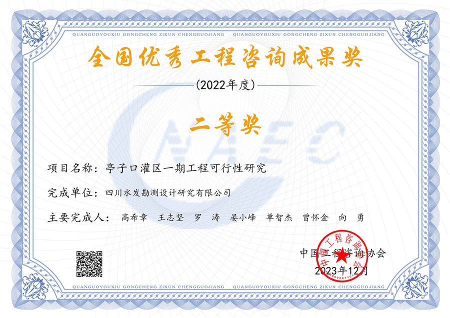 2023年12月29日,在中國(guó)工程咨詢協(xié)會(huì)發(fā)布的《中國(guó)工程咨詢協(xié)會(huì)關(guān)于公布2022年度全國(guó)優(yōu)秀工程咨詢成果獎(jiǎng)獲獎(jiǎng)項(xiàng)目名單的通知》(中咨協(xié)政研(2023)112號(hào))中,四川水發(fā)設(shè)計(jì)公司完成的《亭子口灌區(qū)一期可行性研究》榮獲全國(guó)優(yōu)秀工程咨詢成果二等獎(jiǎng)。