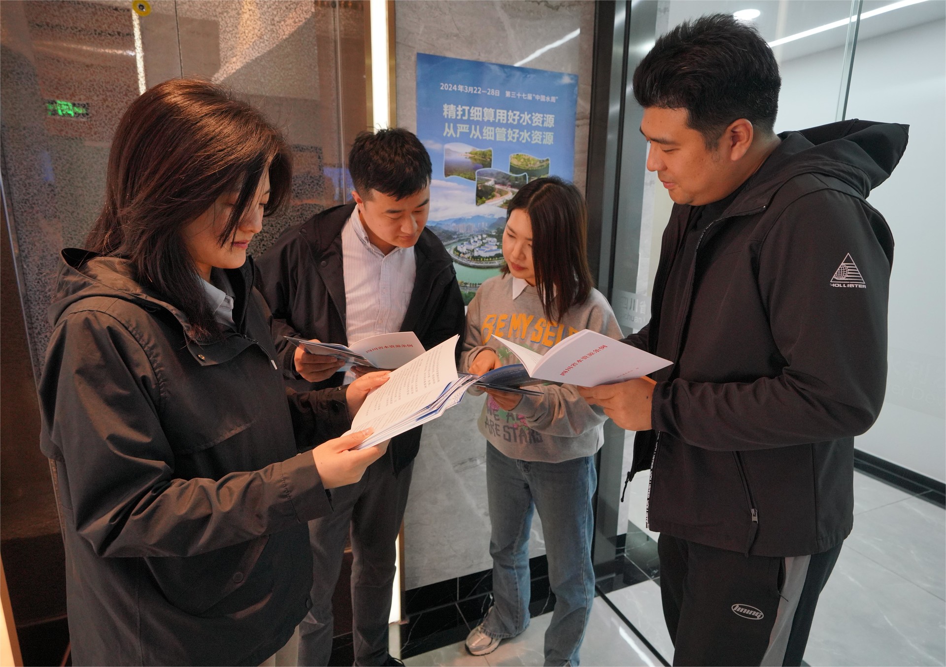 在集團總部,宣傳機連續(xù)播放中央電視臺紀錄片《治水記》,讓大家直觀感受在習近平總書記關(guān)于治水思想的指引下,中國水利建設取得的顯著成就,見證治水興國的戰(zhàn)略思想為糧食安全、經(jīng)濟安全、社會安全、生態(tài)安全和國家安全提供的有力保障。同時,統(tǒng)籌下屬企業(yè)全面啟動世界水日、中國水周宣傳活動,傳遞節(jié)水理念,充分利用現(xiàn)有宣傳平臺,分發(fā)張貼宣傳海報和制作科普小視頻,展現(xiàn)集團在建工程對有效保護、利用水資源的工作成效。