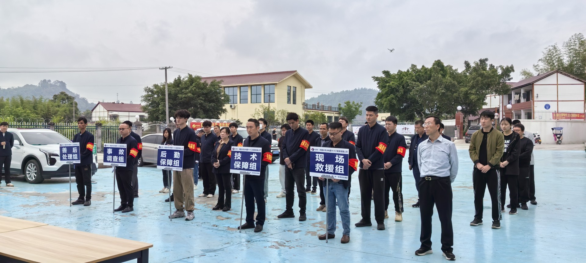 演練模擬營地后方邊坡因強(qiáng)降雨發(fā)生出現(xiàn)邊坡坍塌事故,防洪度汛現(xiàn)場指揮部收到消息后,立即作出全員撤離、組織救援的指令。技術(shù)保障組、現(xiàn)場救援組、后勤保障組按照應(yīng)急預(yù)案第一時間出動開展救援。