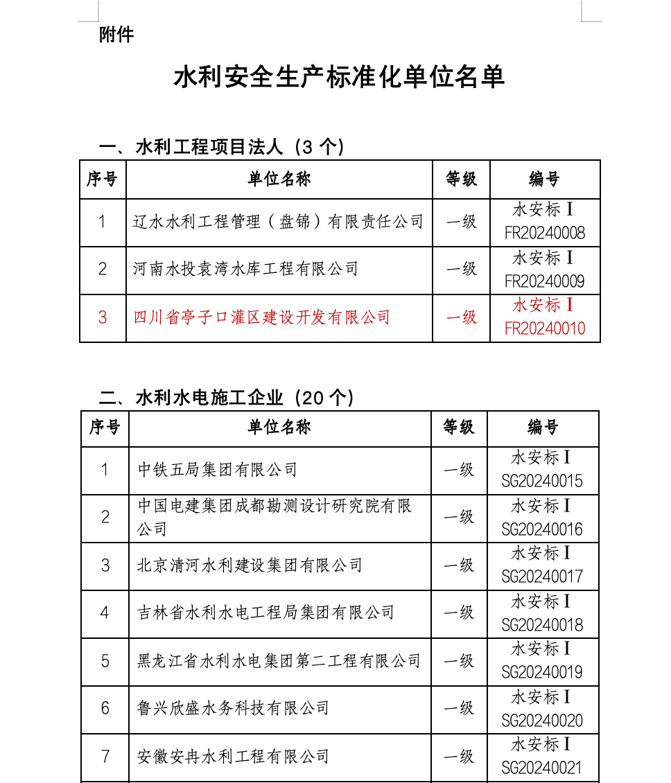 8月7日,水利部公布最新一批水利安全生產(chǎn)標(biāo)準(zhǔn)化一級達(dá)標(biāo)單位名單,亭子口公司光榮上榜。水利安全生產(chǎn)標(biāo)準(zhǔn)化等級是體現(xiàn)水利生產(chǎn)經(jīng)營單位安全生產(chǎn)管理水平的“國家級”重要標(biāo)準(zhǔn),一級達(dá)標(biāo)是水利行業(yè)安全達(dá)標(biāo)的最高等級,本批名單中項目法人達(dá)標(biāo)全國僅有3家單位。