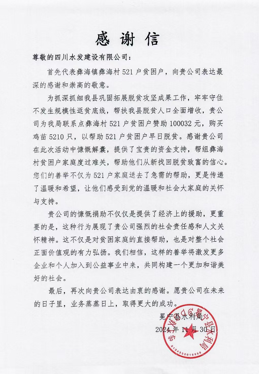 近日,建設(shè)公司收到了來自涼山州冕寧縣水利局的感謝信,涼山州冕寧縣水利局對建設(shè)公司在冕寧縣彝海鎮(zhèn)彝海村開展的系列幫扶舉措表示感謝。