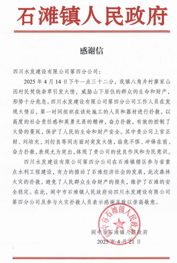 前不久,閬中市石灘鎮(zhèn)八角井村廖家山因村民焚燒雜草突發(fā)火情,火勢兇猛,迅速向民宅蔓延,情況萬分危急。建設(shè)公司四分公司青年突擊隊(duì)聞令而動,化身逆火而行的“鋼鐵戰(zhàn)士”,攜帶滅火器材奔赴火場。面對熊熊烈火,他們無畏無懼,手持鐵鍬、鋼鏟奮力清理可燃物,于上風(fēng)口處奮勇?lián)浯蛎骰穑会槍饎葺^大區(qū)域,熟練使用滅火器進(jìn)行重點(diǎn)攻堅(jiān),并安排專人嚴(yán)密巡查,杜絕復(fù)燃隱患。在這場與時間賽跑、與烈火較量的戰(zhàn)斗中,青年突擊隊(duì)以專業(yè)的救援能力和頑強(qiáng)的拼搏精神,成功控制火情,為保障群眾生命財(cái)產(chǎn)安全筑起堅(jiān)實(shí)防線,用實(shí)際行動詮釋了“水利鐵軍”不畏艱險(xiǎn)、沖鋒在前的奉獻(xiàn)擔(dān)當(dāng),贏得了閬中市石灘鎮(zhèn)人民政府的高度贊譽(yù)與真摯感謝。